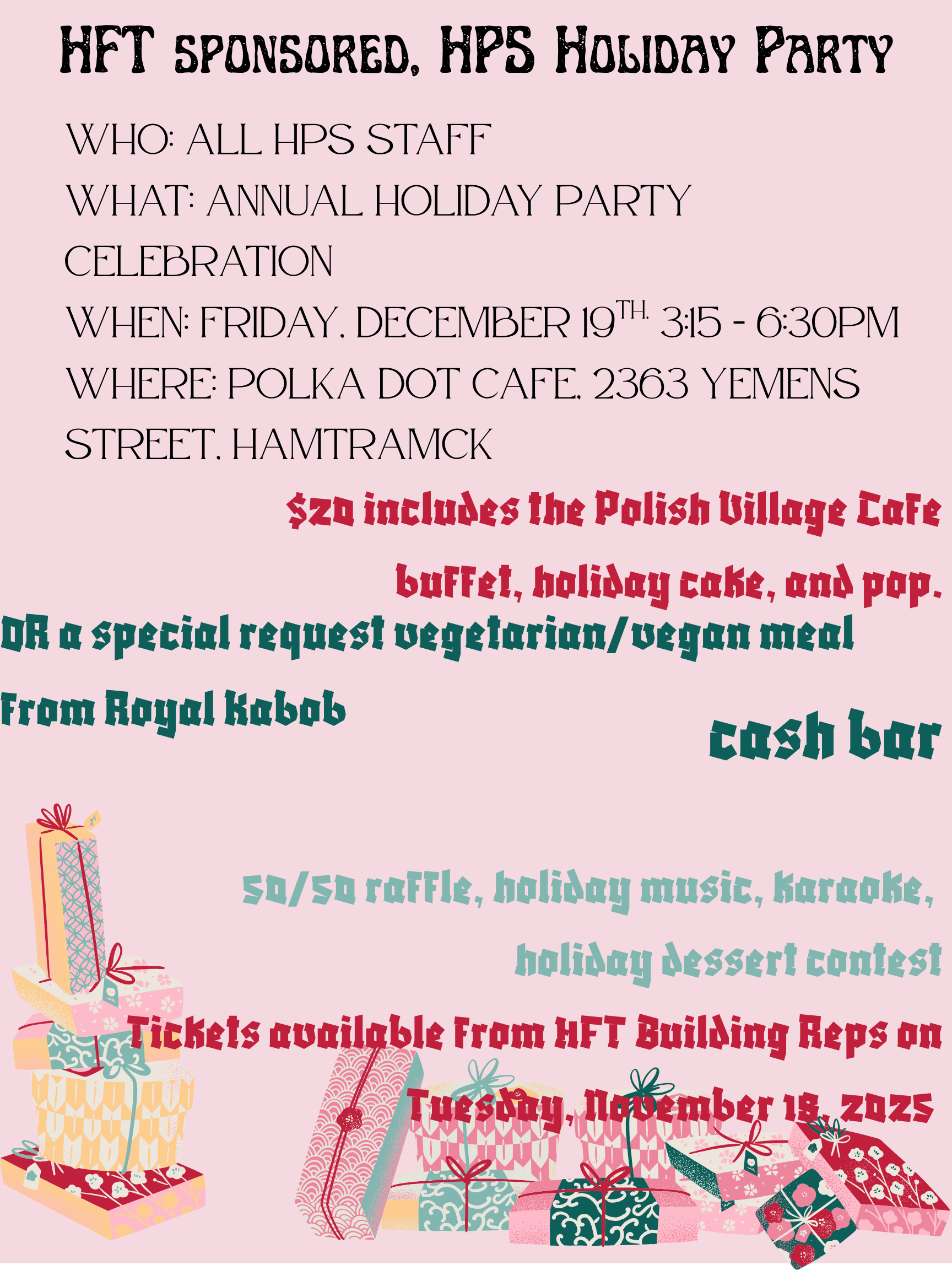 Hello HPS family, join us for our annual Holiday Party taking place, Friday, December 19th, 2025, 3:15-6:30PM, at Polka Dot Cafe, 2363 Yemens Street, Hamtramck.